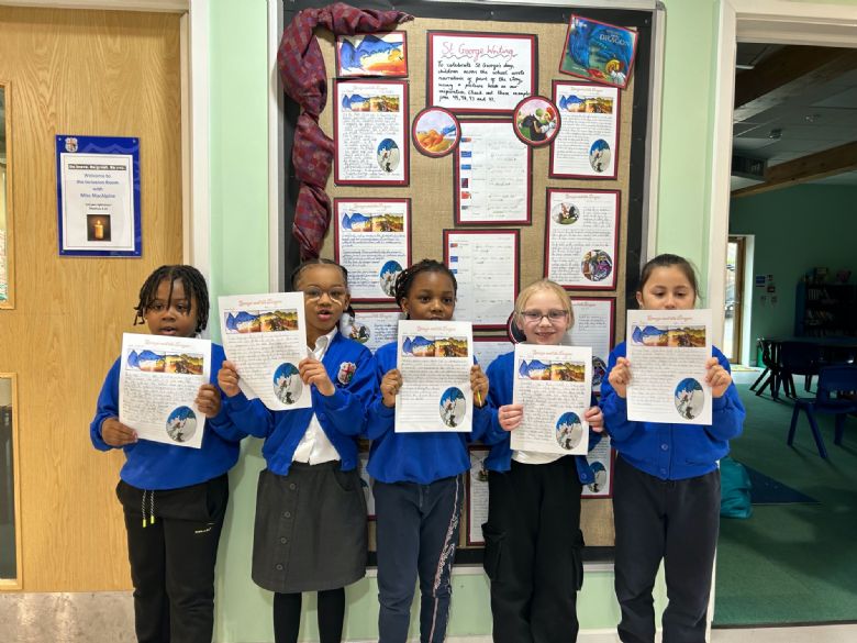 To start with, we were together in whole school worship, where Mr Janes reminded us of the story of Saint George and the Dragon. We had fun joining in with parts of the story, using actions and acting as the characters. Back in class, all children completed a piece of writing based on part of the legend.
