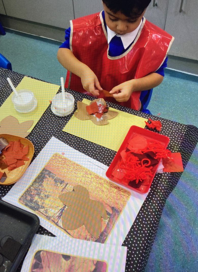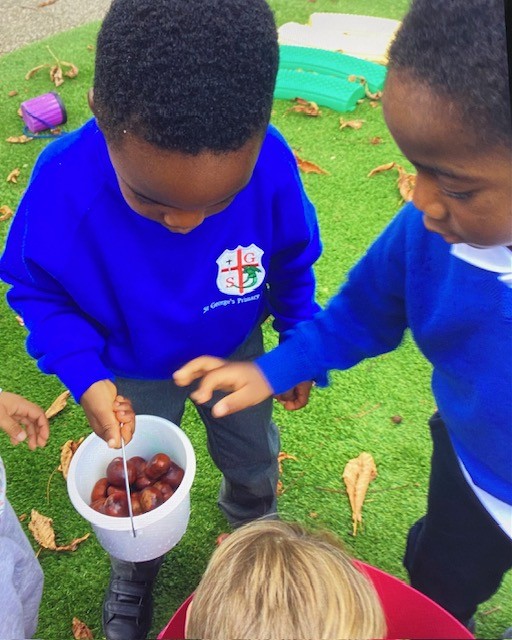 Be an Explorer – noticing the changes in the world around us. Be a Trier – collecting conkers and trying new art techniques. Be a Talker – sharing ideas and recognising friends’ creations. Be a Creator – designing beautiful autumn and “All About Me” collages.