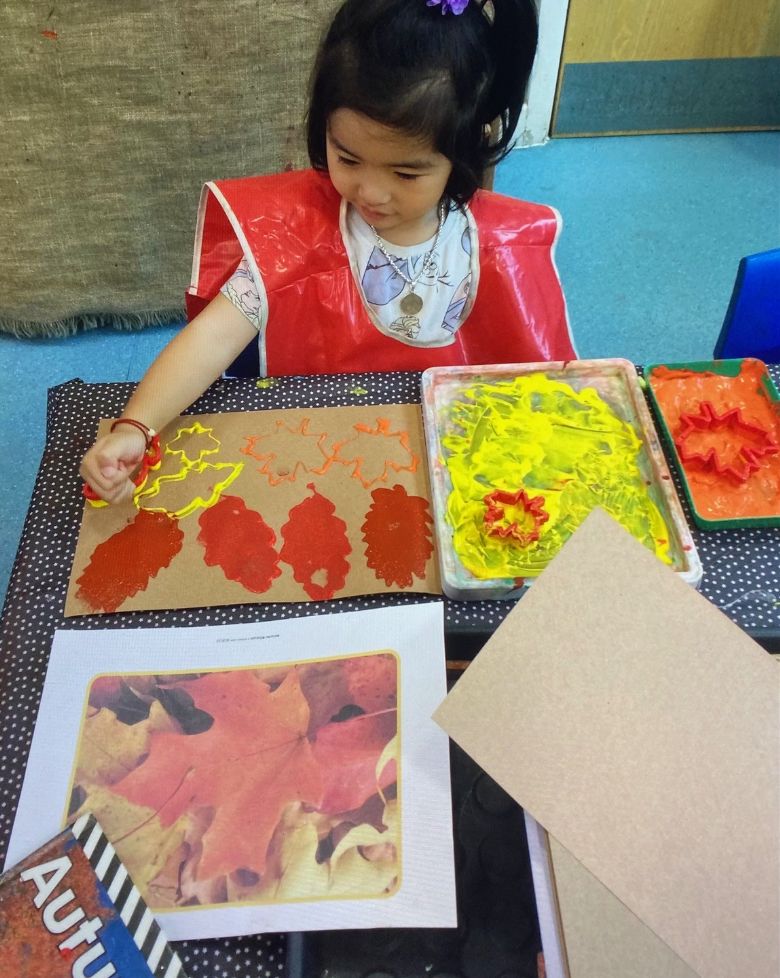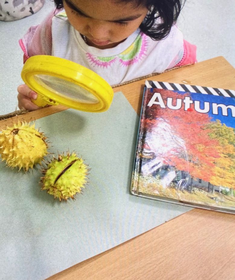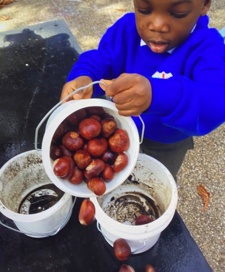 Outdoors, we’ve been looking carefully for signs of seasonal change. Collecting conkers has been a favourite pastime, with lots of excitement as the children discovered shiny treasures hiding inside prickly shells. Inspired by the colours and textures of autumn, we’ve also enjoyed printing and collage activities.