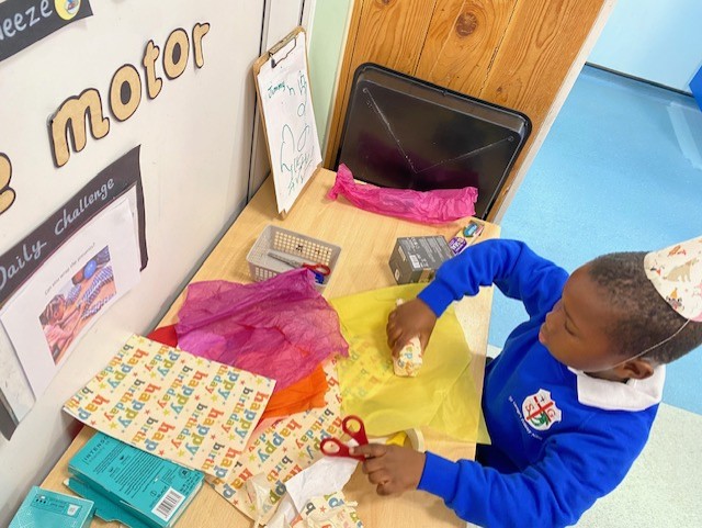 🎁 Be a Trier: In the fine motor area, the children practised their cutting, folding, and taping skills while wrapping pretend presents.