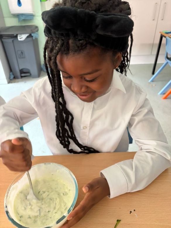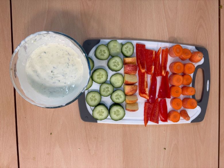 In the afternoon, the class focused on improving their cutting skills 🔪. After learning how to use a vegetable knife safely, the children carefully chopped their own vegetables to make crudités. To go with their crunchy snacks, they made a refreshing tzatziki dip 🥒 by combining yoghurt, cucumber, lemon juice, and mint.