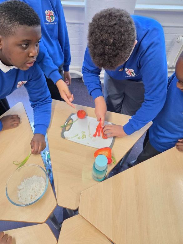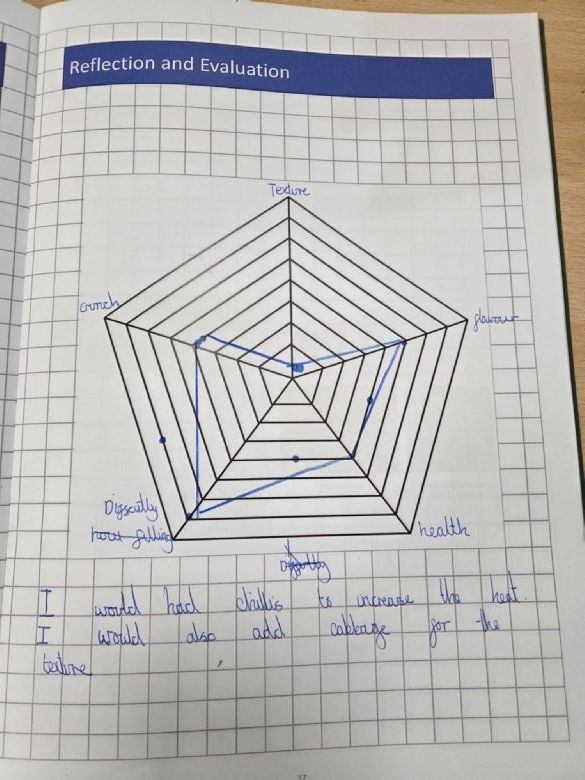 To finish our DT experience, the children evaluated both dishes using a food evaluation pentagram, reflecting on aspects such as appearance, texture, aroma, flavour and nutritional value. This helped them think like real food designers, analysing how well their creations met the brief.
