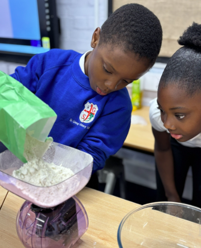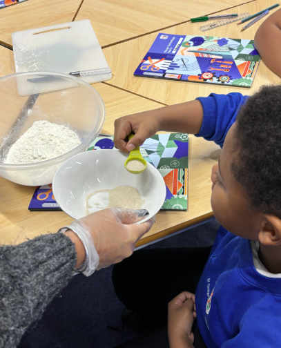 Our first task was baking delicious bread rolls. Starting with bread flour, the children added yeast and warm water, learning how these simple ingredients begin a powerful chemical reaction. We explored the process of fermentation, understanding how yeast feeds on sugars to create carbon dioxide—helping the dough to rise.