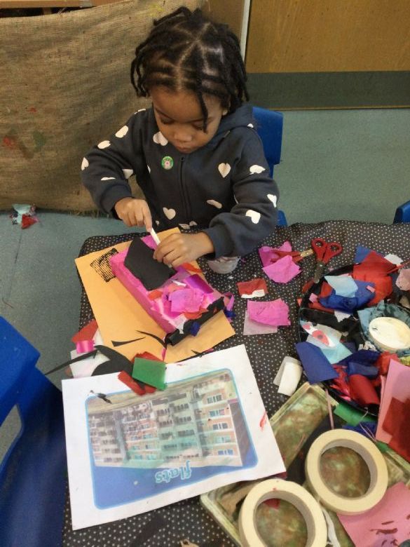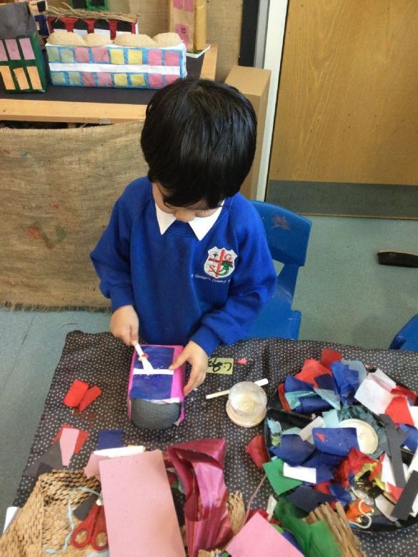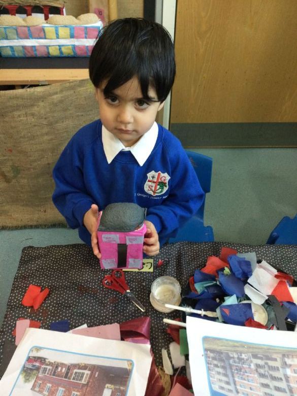 We have been very creative this week too! The children have designed and built their very own houses using a range of junk modelling materials. They explored collage techniques and printing, using paint, paper, cardboard and lots of imagination. We then turned our ideas into a St George’s Nursery Town, filled with streets and homes of all shapes and sizes!