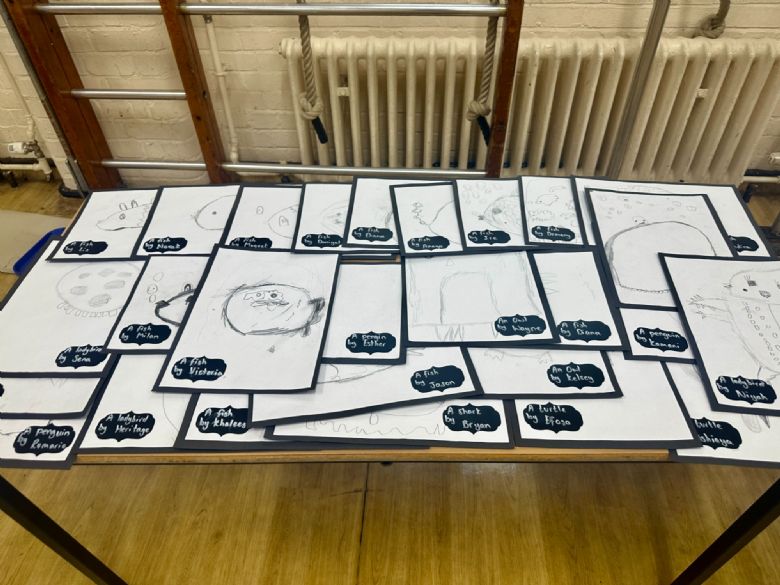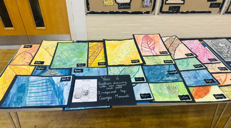 • Year 4 created detailed feather drawings using wax crayons and watercolours, inspired by the work of Giorgio Morandi.