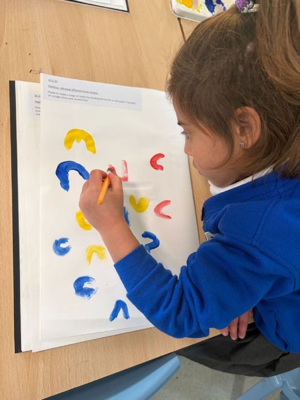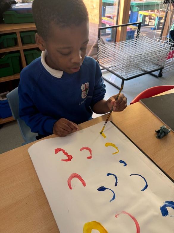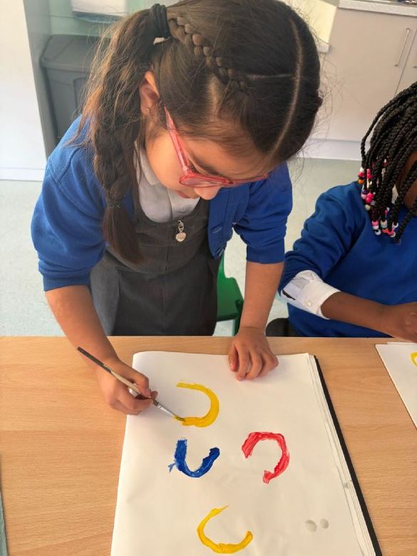 In our first lesson, the children practised how to use a paintbrush correctly. We focused on a special technique called “dip, dip, dab”, which helped the children control their brushes and apply paint carefully. Everyone did a fantastic job remembering to dip their brush gently and dab the paint onto their paper.